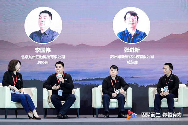 峰會(huì)現(xiàn)場(chǎng),華為中國政企分銷區(qū)域銷售部部長王娜、華為中國政企Marketing高級(jí)營銷經(jīng)理姚本俊和北京九州任馳科技有限公司總經(jīng)理李國偉、蘇州卓越智能科技有限公司總經(jīng)理張進(jìn)新一起進(jìn)行了專題討論,分享伙伴和華為坤靈攜手一年的歷程與收獲。